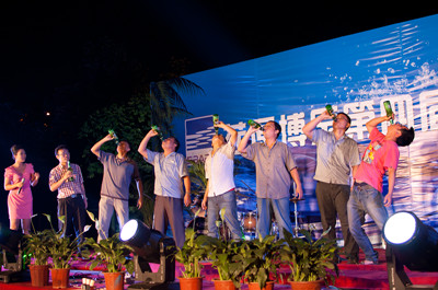 穿插其間的互動(dòng)游戲――喝啤酒比賽,員工們爭(zhēng)先恐后的參加,最后“啤酒王”的桂冠由公司采購(gòu)部員工陳永泰獲得。為整個(gè)晚會(huì)增添了歡樂的氣氛。